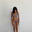 This mid-rise design offers minimal thong coverage. Crafted from recycled polyester with a luxury Italian yarn blend (80% polyester, 20% elastane). Features straps with white silver rings from France. Models wear size small. Ethically made in Spain.